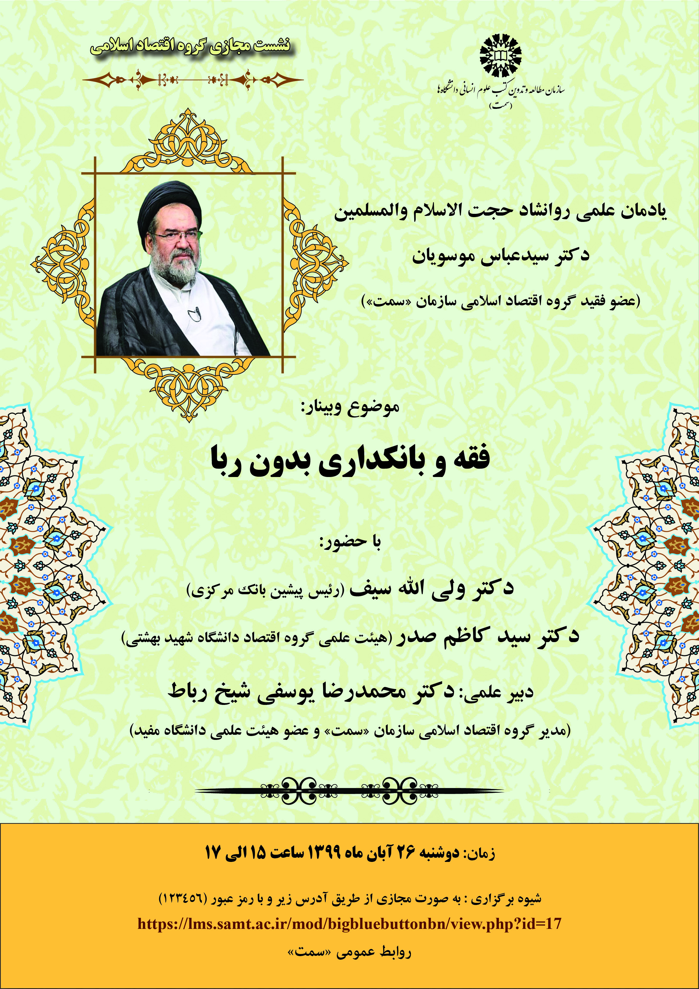 این وبینار که یادمانی علمی مرحوم حجت السلام سیدعباس موسویان عضو فقید گروه اقتصاد اسلامی «سمت» نیز محسوب می‌شود با حضور: