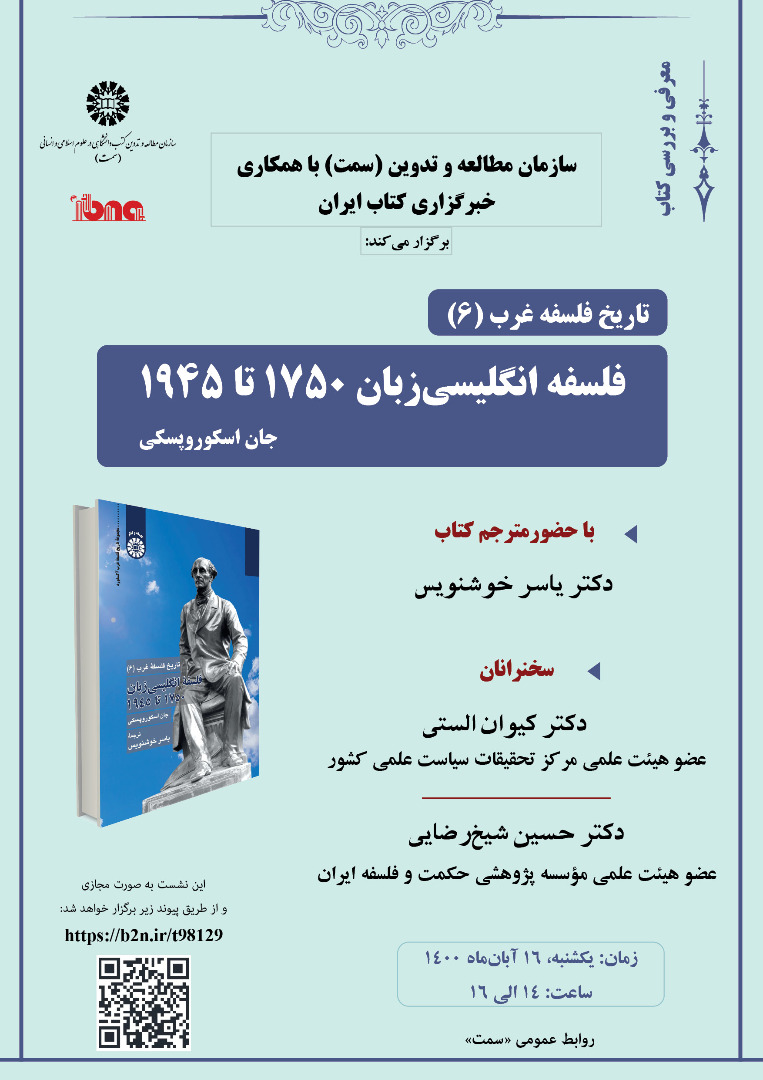 به گزارش روابط عمومی «سمت»، نشست معرفی و بررسی کتاب «تاریخ فلسفه غرب(6)، فلسفه انگلیسی‌زبان 1750 تا 1945» تالیف جان اسکوروپسکی و ترجمه یاسر خوشنویس از سوی سازمان «سمت» و خبرگزاری کتاب ایران (ایبنا) یک‌شنبه 16 آبان‌ماه با حضور کیوان الستی، عضو هیئت علمی مرکز تحقیقات سیاست علمی کشور و حسین شیخ‌رضایی، عضو هیئت علمی موسسه پژوهشی حکمت و فلسفه ایران برگزار شد.