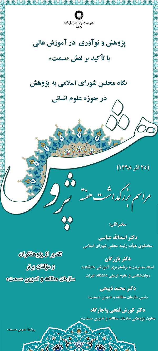 مراسم بزرگداشت هفته پژوهش، روز دوشنبه ۲۵ آذرماه در سازمان «سمت» برگزار می‌شود.