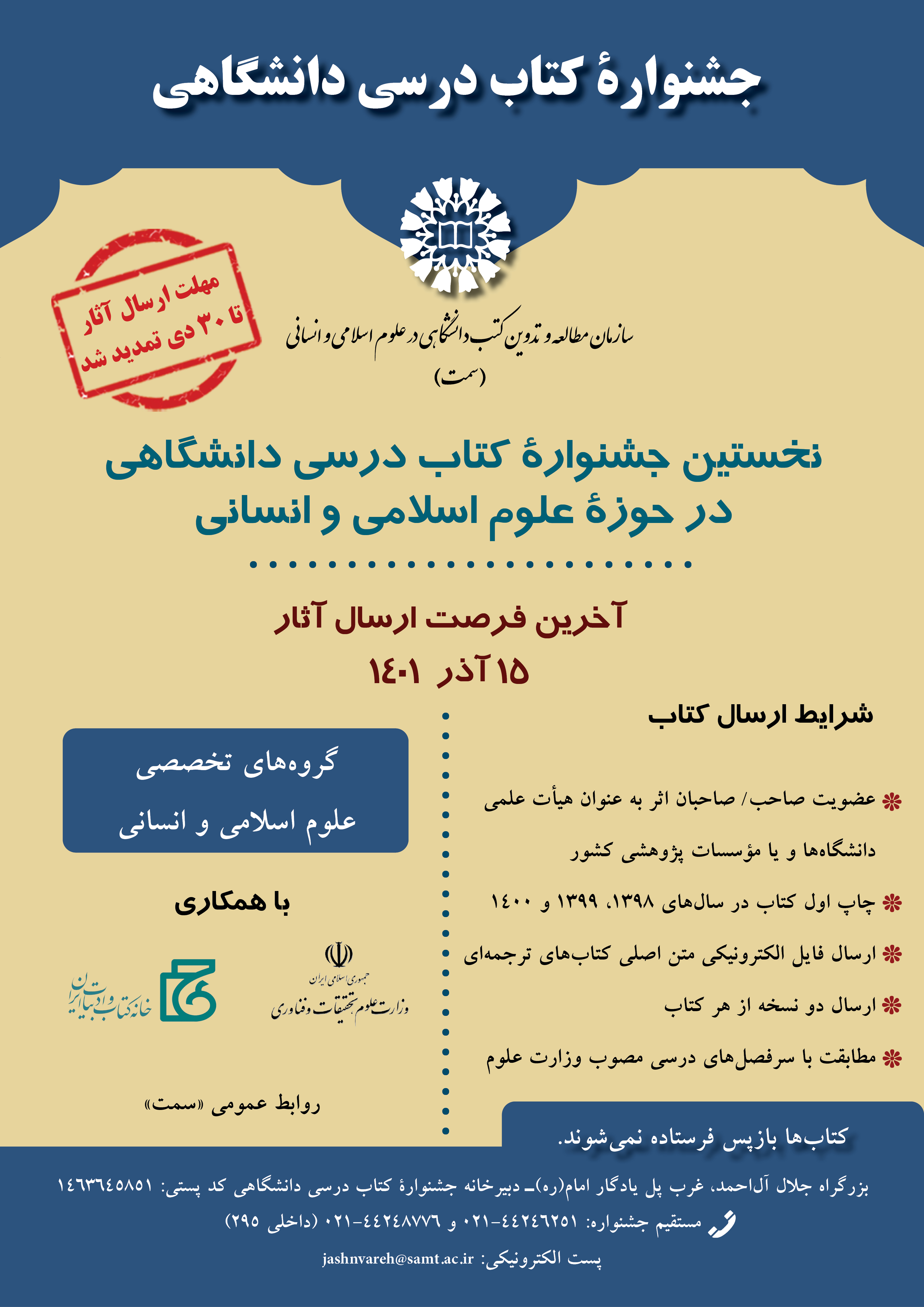 سازمان مطالعه و تدوین کتب دانشگاهی در علوم اسلامی و انسانی (سمت) با تکیه بر جایگاه قانونی و علمی و بهره‌گیری از تجارب خود، در نظر دارد به منظور ارزیابی کمی و کیفی کتاب‌های درسی دانشگاهی در حوزه علوم اسلامی و انسانی و شناسایی و معرفی آثار برتر و تشویق پدیدآورندگان آنها، مراسم انتخاب کتاب درسی دانشگاهی «سمت» را به یاری خدا و به ترتیب زیر برگزار نماید: